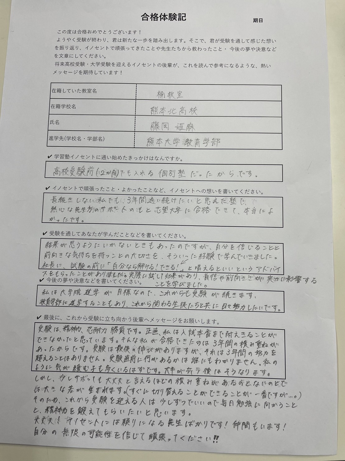 学習塾 イノセント ブログ 楠教室 熊本大学教育学部合格!~合格体験記~ 熊本大学教育学部合格!~合格体験記~ 楠教室熊本県合格体験記大学入試 2024年3月25日 熊本北高から熊本大教育学部現役合格! 熊本北高校から近い楠教室に通ってくれていましたが、見事入試を突破し、熊大教育学部に合格!本当に夢実現の第一歩に立てることを手助け出来てとても嬉しかったです! 本当におめでとう!! 前の記事へ 一覧に戻る 次の記事へ 関連記事 楠・武蔵ヶ丘・清水で塾を探すなら?|イノセント学習塾楠教室 楠・武蔵ヶ丘・清水エリアで塾を探している方へ 圧倒的な実績を出しているイノセ... 楠教室 2025年9月12日 高校生に塾は必要? こんにちは!学習塾イノセント楠教室の山室です! 楠、清水、龍田、武蔵ヶ丘エリアの... 楠教室 2025年9月10日 国立大学合格地域1番目指してます😊 国立大学合格率、合格者数地域1番を目指してます😊 ... 八代教室合格実績 2025年9月4日 高校生~!テスト対策始めるぞ✊ こんにちは!学習塾イノセント楠教室の山室です! 夏期講習も終わり、今週から通常授... 楠教室 2025年9月2日 🌸【玉名市・周辺の皆さんへ】2学期スタートダッシュ大作戦!📚✨ こんにちは!学習塾イノセント玉名教室です🌈1ヶ月半の夏期講習が無... 玉名教室熊本県 2025年8月30日 定期テストに向けて全力スタート! 八代のみなさん、こんにちは。八代教室の岡田です。 夏期講習を受講してくれたみなさ... 八代教室熊本県 2025年8月28日