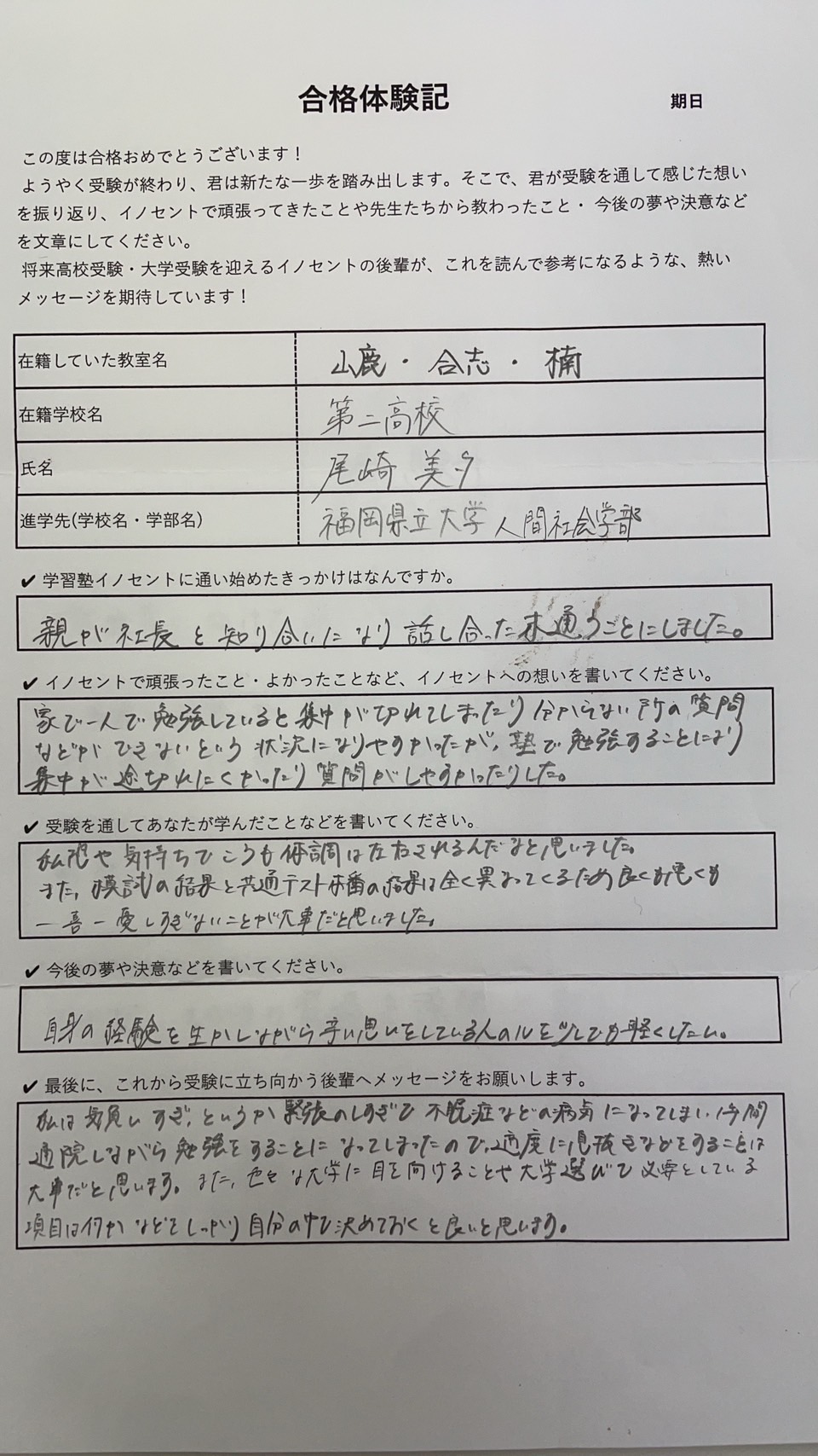 学習塾 イノセント ブログ 津福教室 福岡県立大学人間社会学部合格インタビュー 福岡県立大学人間社会学部合格インタビュー 津福教室北野町教室田主丸教室合志教室人吉教室山鹿教室八代教室英語学習・英検定期テスト大学入試 2023年4月3日 福岡県立大学人間社会学部合格! 前の記事へ 一覧に戻る 次の記事へ 関連記事 津福・安武で塾を探すなら?|イノセント学習塾津福教室 津福・安武エリアで塾を探している方へ 圧倒的な実績を出しているイノセント学習塾津... 山鹿教室 2025年9月12日 八代で塾を探すなら?|イノセント学習塾八代教室 八代エリアで塾を探している方へ 圧倒的な実績を出しているイノセント学習塾八代教室... 八代教室 2025年9月12日 田主丸・うきはで塾を探すなら?|学習塾イノセント田主丸教室 田主丸・うきはエリアで塾を探している方へ 圧倒的な実績を出しているイノセント学習... 田主丸教室 2025年9月12日 合志・菊陽で塾を探すなら?|イノセント学習塾合志教室 合志・菊陽エリアで塾を探している方へ 圧倒的な実績を出しているイノセント学習... 合志教室 2025年9月12日 北野町・小郡・宮の陣で塾を探すなら?|イノセント学習塾北野町教室 北野町・小郡・宮の陣エリアで塾を探している方へ 圧倒的な実績を出しているイノセン... 北野町教室 2025年9月12日 人吉市・球磨郡で塾を探すなら?|イノセント学習塾人吉教室 人吉市・球磨郡エリアで塾を探している方へ 圧倒的な実績を出しているイノセント学習... 人吉教室 2025年9月12日