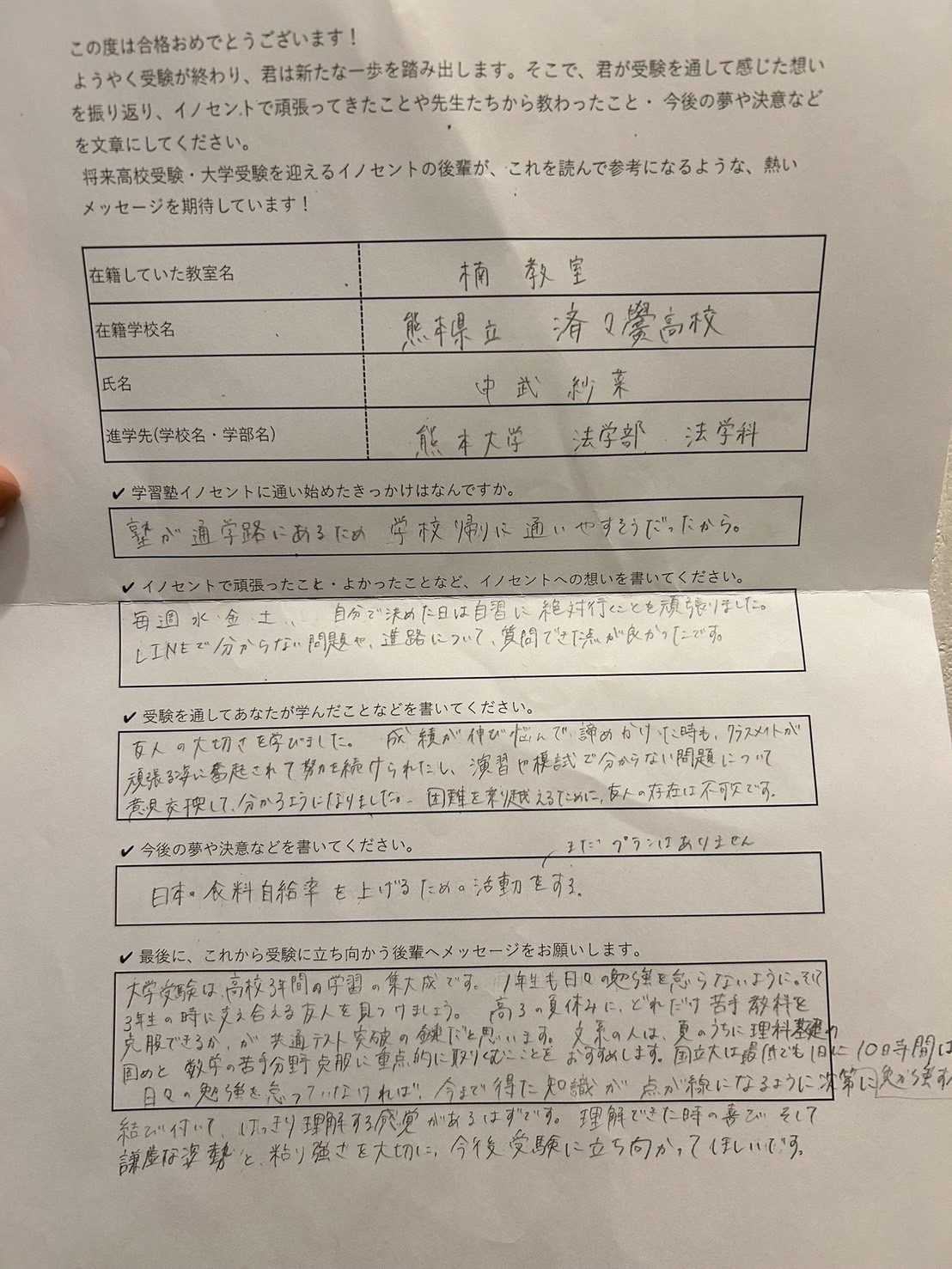 学習塾 イノセント ブログ 合格体験記 見事!熊本大学法学部合格!~合格体験記~ 見事!熊本大学法学部合格!~合格体験記~ 合格体験記 2024年3月25日 済々黌から熊本大法学部現役合格! 学校からの帰りで通える楠教室に通学してくれていた中武さん!ルーティンを作って、分からないところは事前にピックアップして質問し、効率よく勉強してくれました! 現役での合格おめでとう!! 前の記事へ 一覧に戻る 次の記事へ 関連記事 国立大学合格地域1番目指してます😊 国立大学合格率、合格者数地域1番を目指してます😊 ... 八代教室合格実績 2025年9月4日 2025熊本大教育学部合格者体験記 熊本大学教育学部教員養成課程合格! 学習塾イノセントに通い始めたきっかけは? 高... 人吉教室合格体験記 2025年3月2日 2025長崎国際大合格者体験記 長崎国際大健康管理学部合格! 学習塾イノセントに通い始めたきっかけは? いとこか... 北野町教室合格実績 2025年3月2日 2025久留米学園高校合格者体験記 久留米学園高校合格! 学習塾イノセントに通い始めたきっかけは? 高校受験のため ... 北野町教室合格体験記 2025年2月6日 2025三井高校普通科スポーツ健康コース合格者体験記 三井高校普通科スポーツ健康コース合格! 学習塾イノセントに通い始めたきっかけは?... 北野町教室合格実績 2025年2月6日 2025九州ルーテル学院大人文学部児童教育科合格者体験記 九州ルーテル学院大学人文学部児童教育科に合格!! 学習塾イノセントに通い始めたき... 山鹿教室合格実績 2025年2月6日