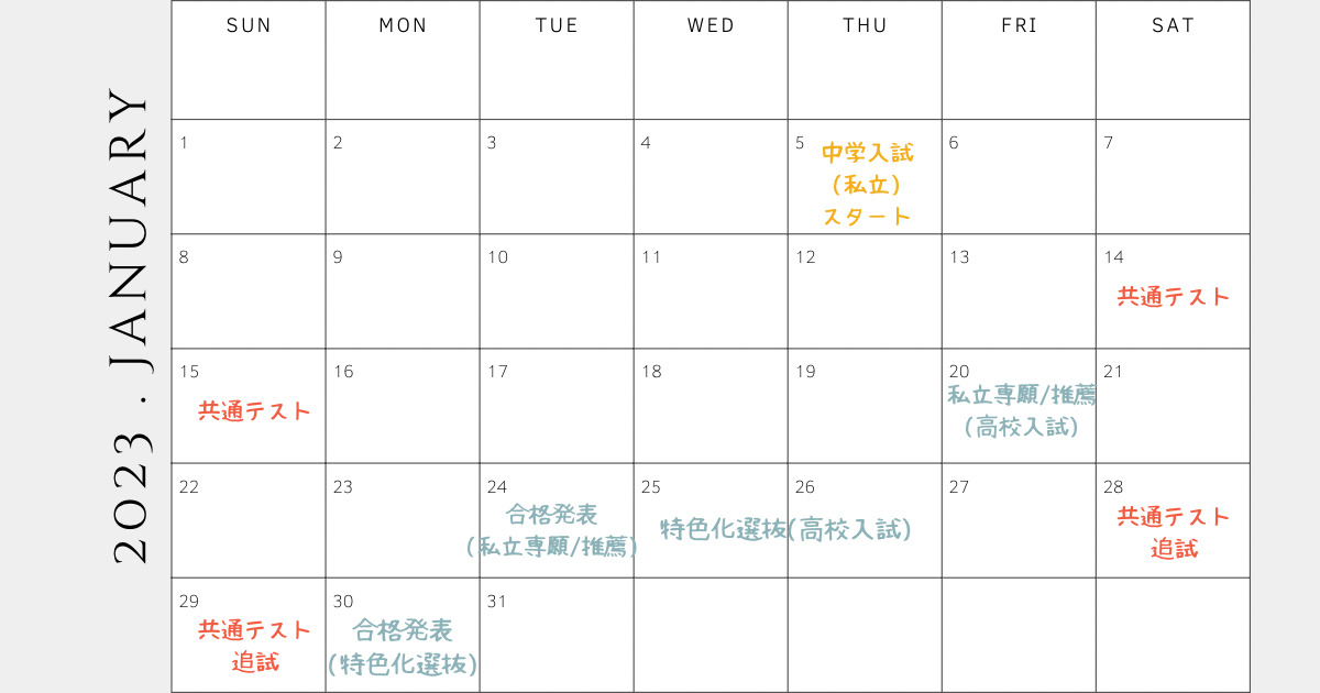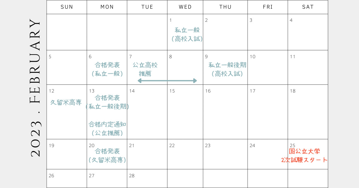 これから入試が立て続けにあります。ここで今後の入試日程をお知らせいたします。来年度の受験生は1年の計画に役立ててください!(中学入試/高校入試:筑後地区のみ、私立大学は各大学のHPをご覧ください。)