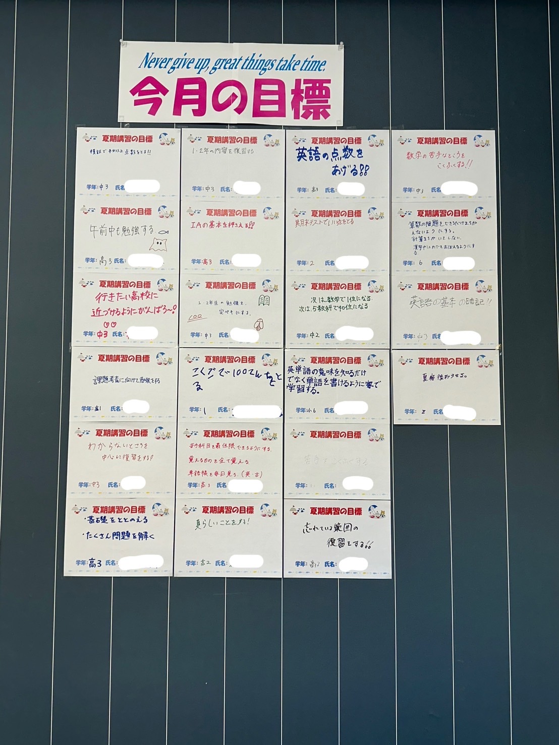 何か一つでも「これだけは誰にも負けないくらい勉強した!」「テストで満点取れて自信がついた!」と実感できるように、生徒それぞれに夏の目標を考えてもらいました。
