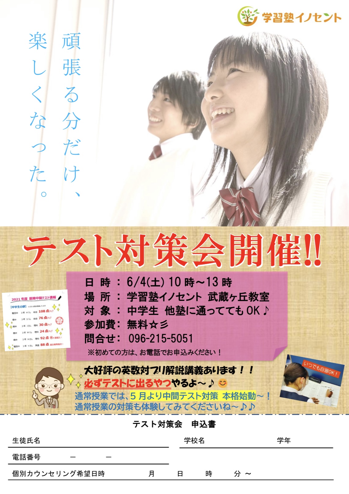 合志・泗水・武蔵ヶ丘・須屋・菊陽地区の中学生の皆さんこんばんは。