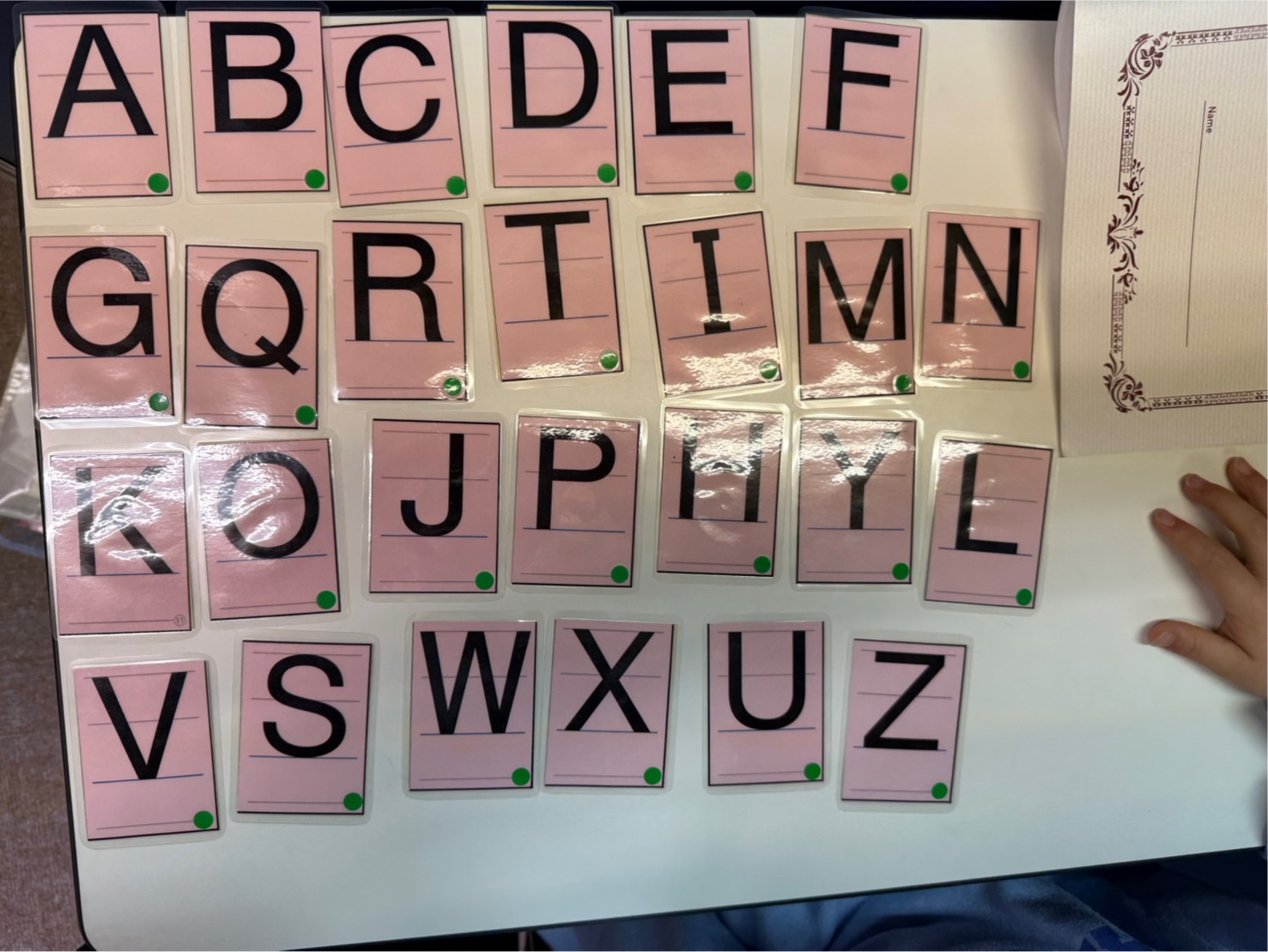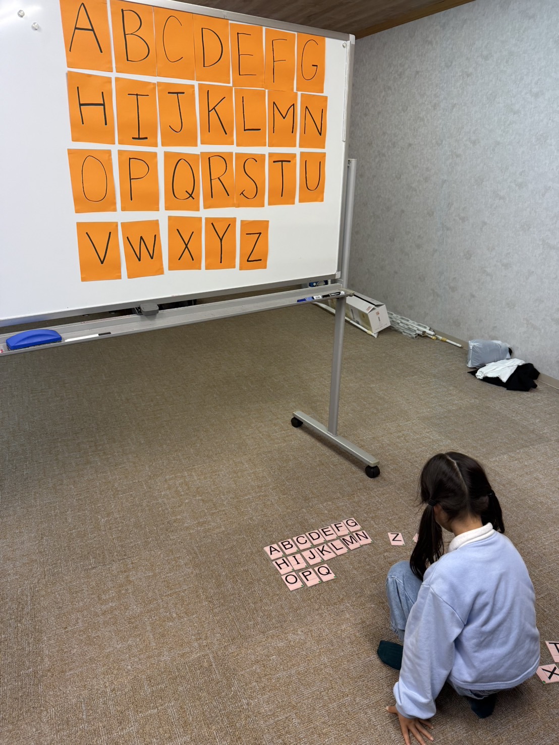 写真のようにホワイトボードを見ながら、自分でカードを並べてA~Zの順番を覚えていきます。